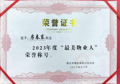 29 12月2023 了解詳情 通皓物業(yè)項(xiàng)目經(jīng)理榮獲"最美物業(yè)人"榮譽(yù)稱(chēng)號(hào) 近日,在淮北市物業(yè)協(xié)會(huì)一年一度的“最美物業(yè)人”選舉中,通皓物業(yè)東湖家園項(xiàng)目經(jīng)理房春東脫穎而出,榮獲“最美物業(yè)人”榮譽(yù)稱(chēng)號(hào)。